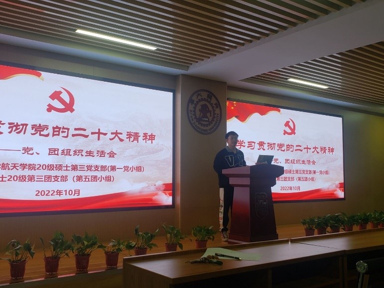 20级硕士生第三党支部联合20级硕士第三团支部在2-4197会议室采用线上线下相结合的方式开展了以“学习党的二十大精神,争做新时代有为青年”为主题的组织生活会,两个支部全体党员及积极分子、部分团员参加,会议由党支部书记付岳主持。