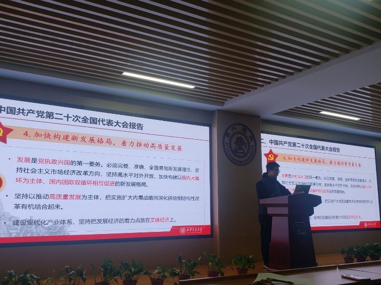 通过观看中国共产党国际形象网络宣传片以及领学党的二十大报告,支部成员回顾并学习了党的二十大报告的相关内容,重温了习近平总书记勉励广大青年的谆谆话语以及殷殷嘱托。江欣同学表示,交大学子要以高度的历史责任感、时代使命感和奋斗精神,学习弘扬伟大建党精神,勇担时代发展重任,努力成为德智体美劳全面发展的社会主义建设者,将青春、汗水和热血融入到党和国家的伟大事业,用奉献、奋斗和才干为党和人民贡献青春力量。