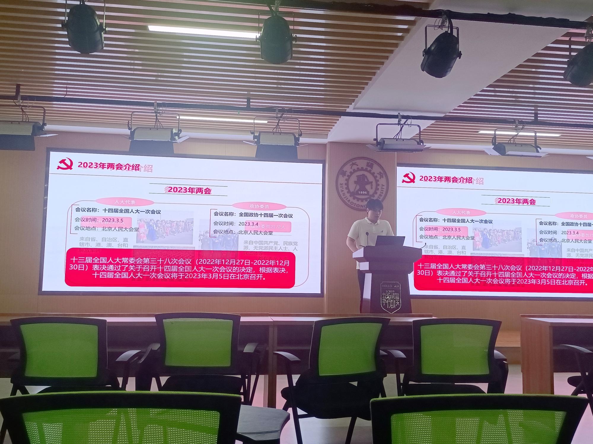 潘浩同志就两会的基本情况进行了介绍。首先介绍了十四届全国人大一次会议和全国政协十四届一次会议的主要议程。他表示:“2022年是党和国家历史上极为重要的一年。党的二十大胜利召开,描绘了全面建设社会主义现代化国家的宏伟蓝图。面对风高浪急的国际环境和艰巨繁重的国内改革发展稳定任务,以习近平同志为核心的党中央团结带领全国各族人民迎难而上,全面落实疫情要防住、经济要稳住、发展要安全的要求,加大宏观调控力度,实现了经济平稳运行、发展质量稳步提升、社会大局保持稳定,我国发展取得来之极为不易的新成就。”