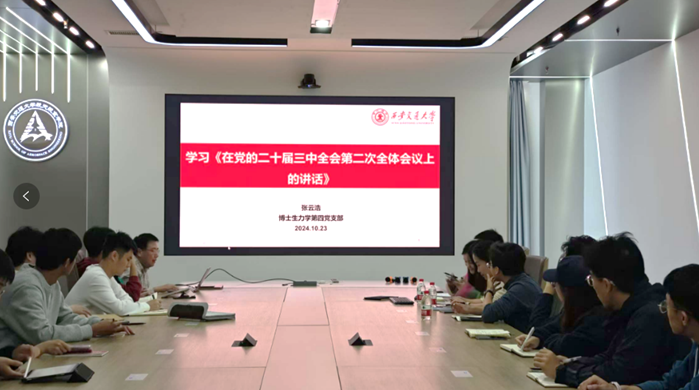 会上,博士生力学第四党支部书记张云浩带领全体与会成员原原本本学习《习近平:在党的二十届三中全会第二次全体会议上的讲话》,并围绕学习贯彻党的二十届三中全会精神开展交流研讨。