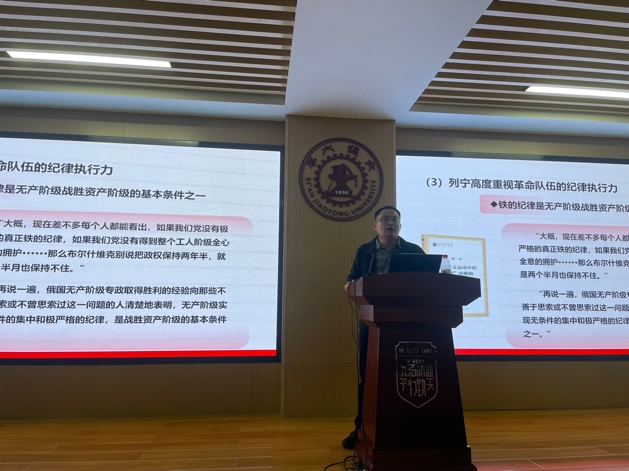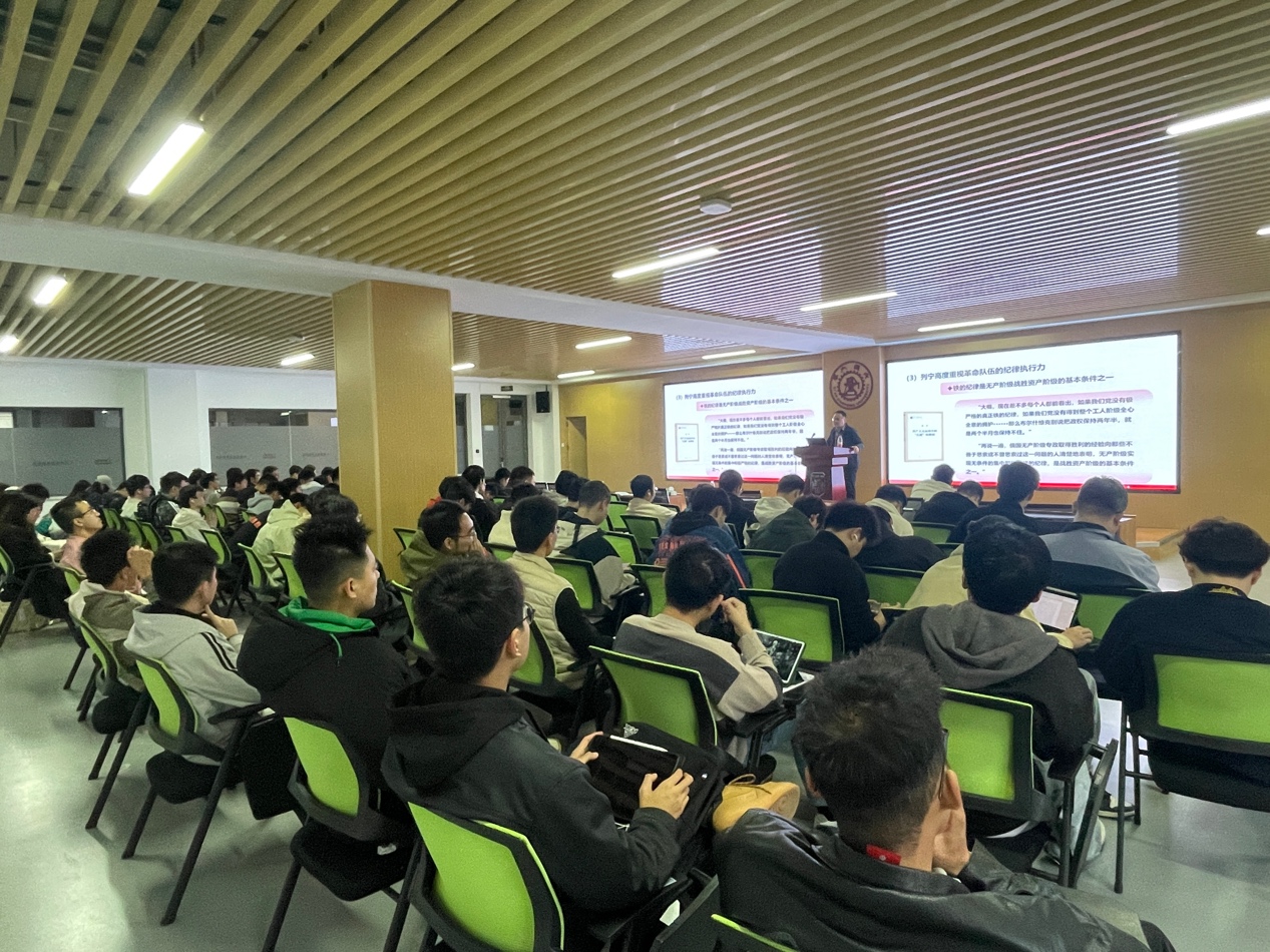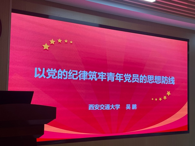 吴鹏老师以《党的纪律牢筑青年党员的思想防线》为题,从纪律严明是中国共产党的光荣传统、党的纪律是青年党员的紧箍咒和护身符、青年党员要做“学知明守”的践行者三个方面深刻阐述党规党纪的重要性,并向各位同学强调:每位同学都应牢记,纪律是规范每个人行为的重要准则,无论何时何地,都必须严格遵守。