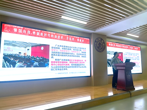 李昱静老师为同学们讲授了题为《学习党史,强国有我》的主题党课,带领同学们回顾了中国共产党建党百年的历史,引导同学们以宏观的视野去认识和理解中国共产党与中国社会发展的紧密联系。李老师对到场的学生积极分子、入党发展对象寄予殷切的厚望,希望同学们能够学习先辈们为理想和信念而英勇奋斗的精神、为了国家和民族而无私奉献的情怀,为了社会的进步和人民的幸福而不断进取的决心。