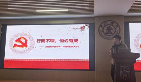 白鑫祖以“英雄航天员邓清明”为题,作事迹分享。邓清明,一位没有执行过飞天任务的宇航员,二十多年来一丝不苟地做着“备份”,悄悄发出光和热的英雄航天员形象深深扎根在了与会人员的心中。“无论主份还是备份,都是航天员的本分”,一句话道出了邓清明的职业操守、责任担当。他鼓舞大家以“功成不必在我,功成必定有我”的精神,在推进强国建设、民族复兴伟业中展现青春作为、彰显青春风采、贡献青春力量,奋力书写为中国式现代化挺膺担当的青春篇章。